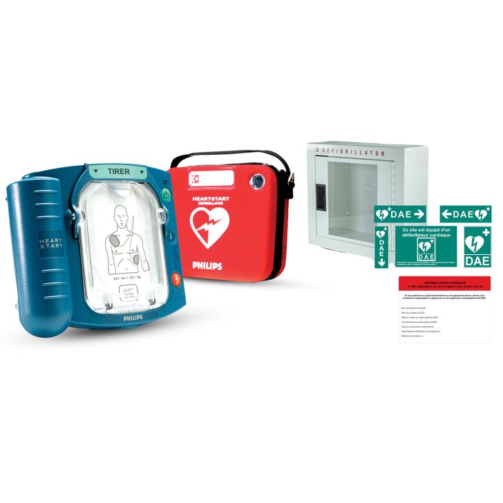 Ce pack Simplicité avec DAE HeartStart HS1 Philips, armoire pour l'intérieur et accessoires indispensables est conforme à la réglementation. Complet, il facilite votre installation.